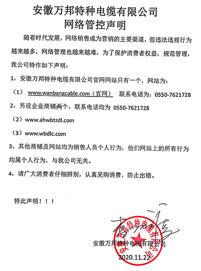 鄭重聲明:安徽萬邦特種電纜有限公司官方網站為:www_wanbangcable_com.bluemiao.cn,除此之外無任何子網站或合作網站,其余均為假冒偽劣。電話:0550-7621728 13485756353 地 址:安徽省天長市滁州高新技術產業開發區經四路29號